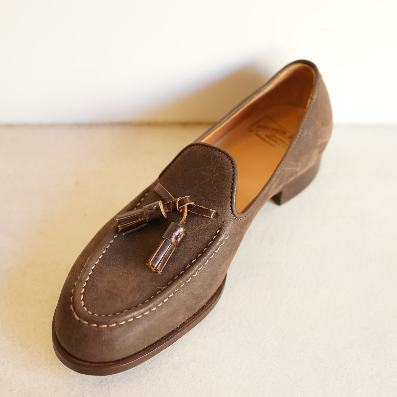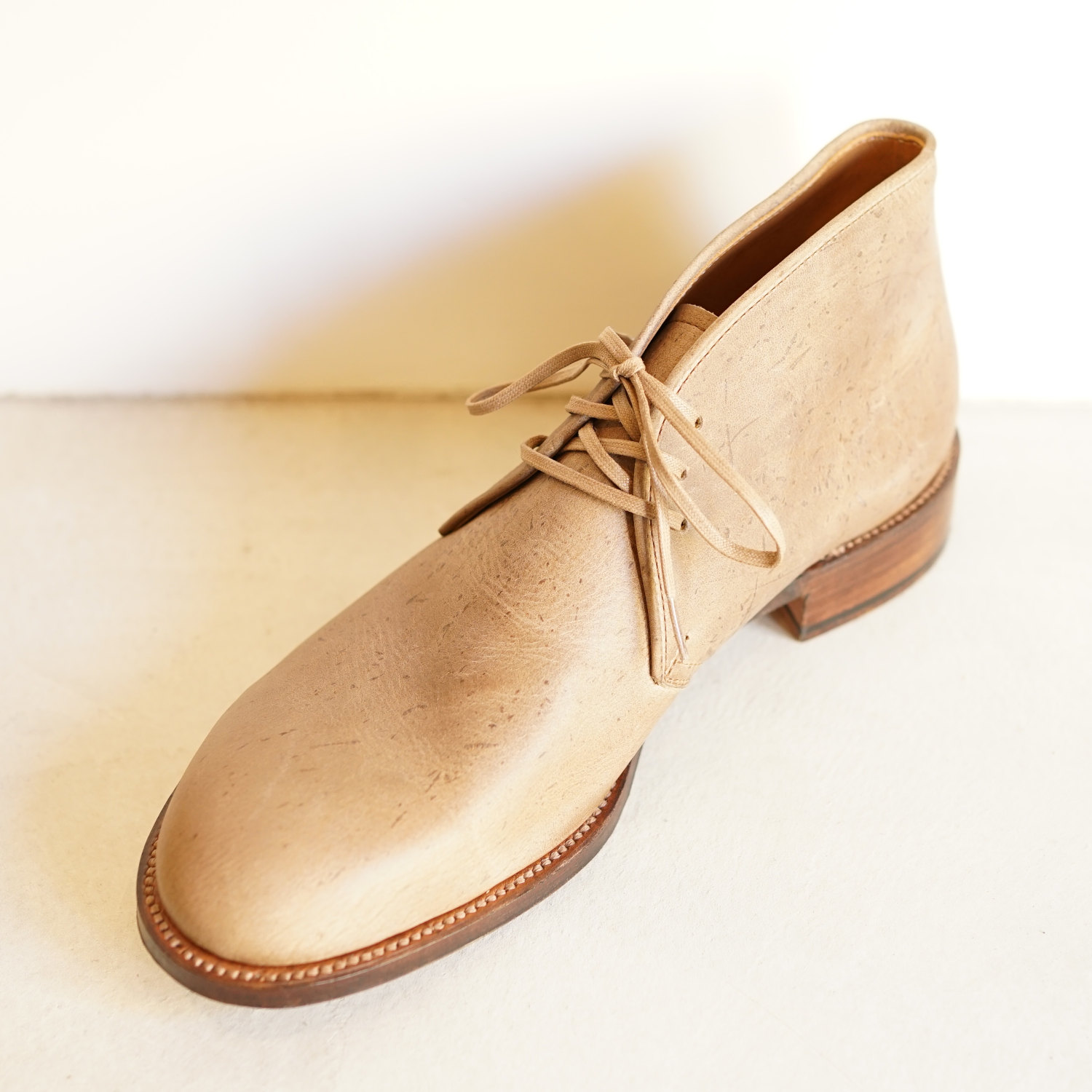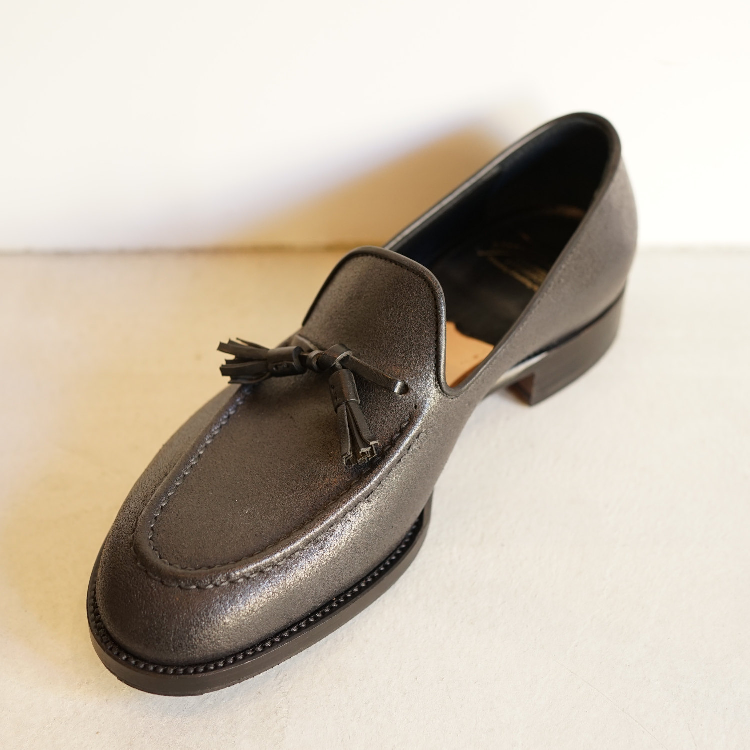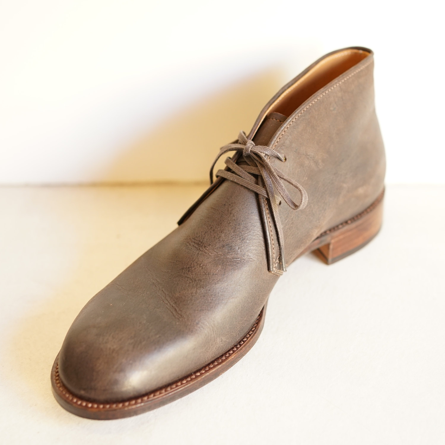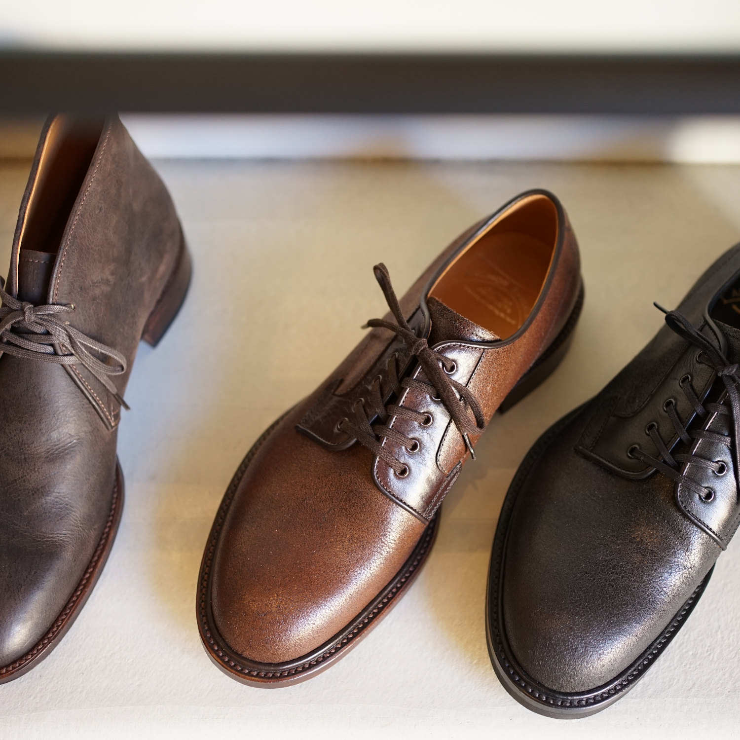 アンカーブリッジのレザーシューズでおすすめしたいのは私自身も長く愛用しているタッセルローファーとチャッカーブーツ、そしてブルーチャーの3種類だ。 ローファーは6年以上愛用しており、ソール交換を繰り返しながら今でも一軍スタメン状態をキープし続けている。これから先もこの靴が私のワードローブから外れることはないだろう。本格的なドレスシューズの要素を完璧に抑えつつも、使用するレザーにおいてはクーズーなど、遊び心がたっぷりのチョイスだ。アンカーブリッジの靴はこのバランス感覚が素晴らしいのである。例えるなら当店定番のデニムスーツのようなものだろうか。ドレスとカジュアルの中間的な立ち位置で、どちらにも広いふり幅のあるアイテムだ。私の愛用しているローファーもイタリアBadalassi Carlo社のReverse Leatherを使用しているため、ドレス感がそれほど強くなく、スーツスタイルにもカジュアルスタイルにもはまる絶妙な立ち位置がウリだ。軍パンをキレイ目にスタイリングしたい時や、またスーツスタイルでも少し力を抜いたスタイリングをしたい時にとてもしっくりくる。もちろん革質がよりフォーマルなものになれば同じカタチでもスーツスタイルにビシっと決まるドレッシーな靴になる。1年に2回開催するオーダー会ではそのようなドレッシーな靴もオーダーが可能だ。木型も独特のシェイプで、日本人の足によく合う木型ながらデザイナー自身の曲線へのこだわりもしっかりと表現されている。