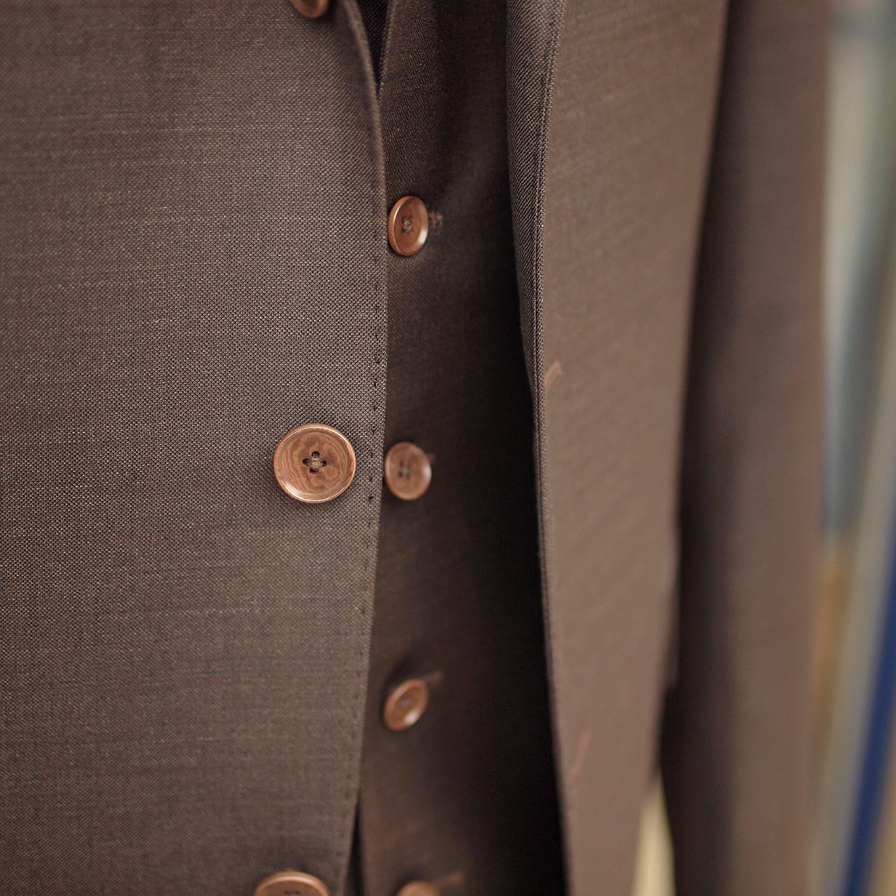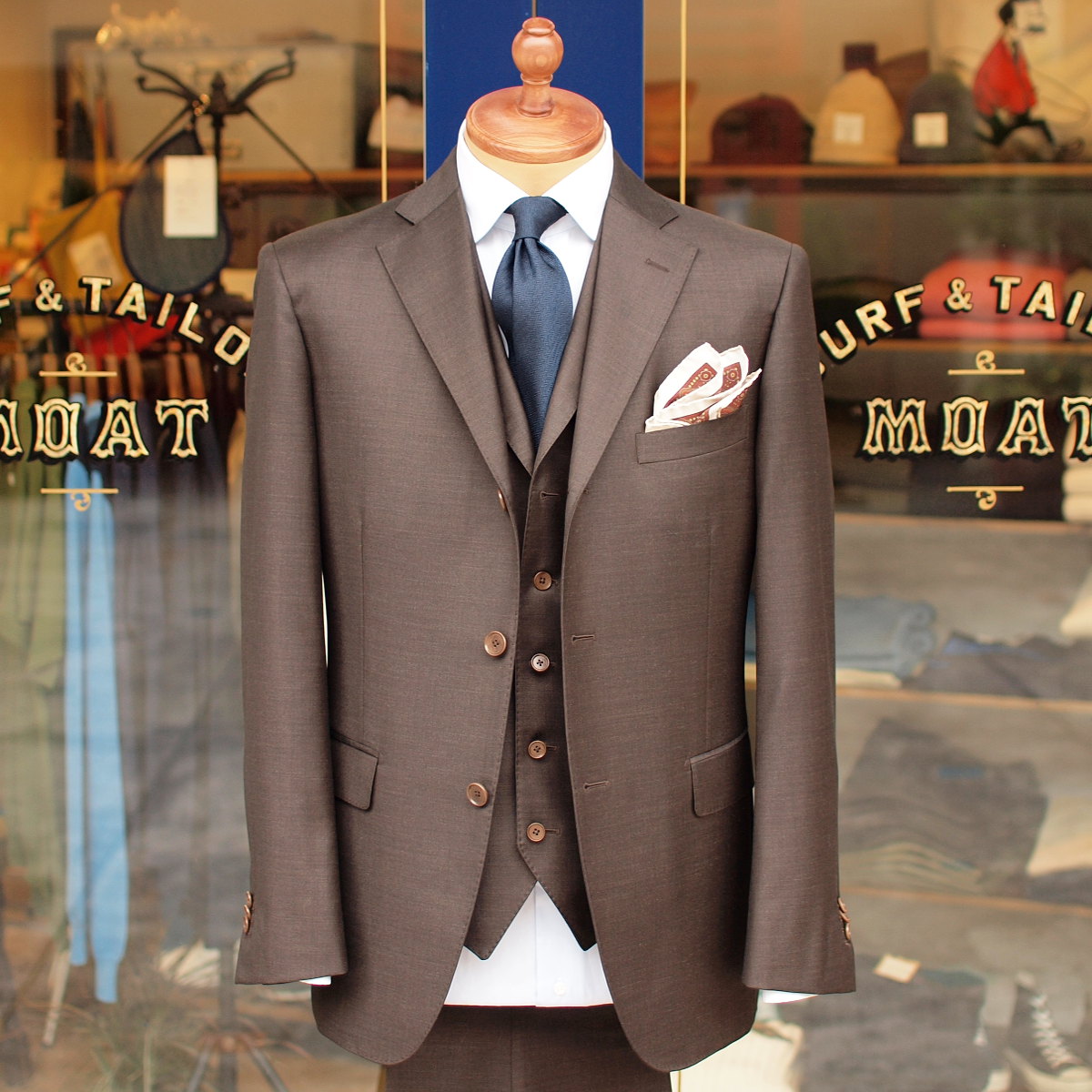 光沢感が強く高級感あふれるブラウンの生地を使用したスリーピーススーツ。